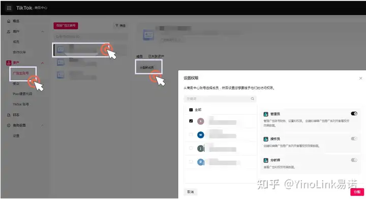 TikTok for Business广告账户绑定到BC后,BC管理员可在左侧边栏“广告主账号”看到对应的广告账户。BC管理员可以在广告账户中给自己及BC内其他成员分配广告账户的的权限(管理员/操作员/分析师)。