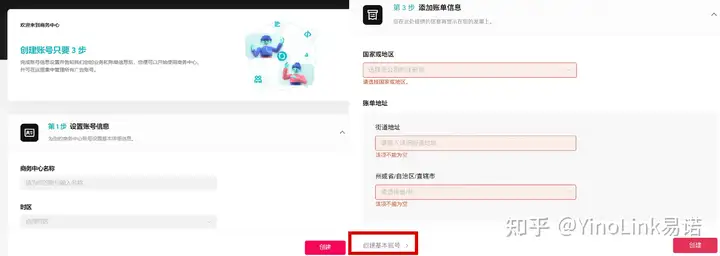 如果创建时跳转到下图左侧页面,则只需填写好商务中心名称和时区,在页面最下方点击页面左下角的“创建基本账号”进入BC创建流程。