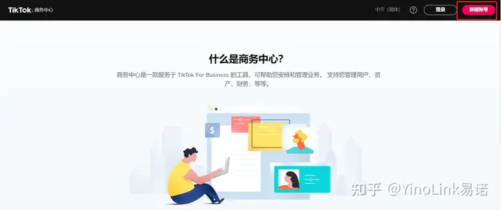 只有TikTok for Business的用户可以创建广告账户、创建TikTok商务中心账户、被分配角色以及获得资产访问权限。可以通过“https://business.tiktok.com”链接进行注册,进入页面后点击页面右上角“新建账号”。