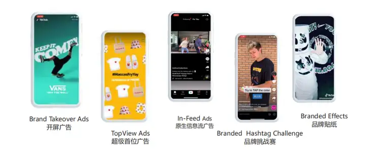 1)开屏广告:当用户打开TikTok时,视频/图片广告会以全屏的形式出5-60秒; 2)超级首位广告:第一个屏幕打开后显示的广告,不能滑走,强制要看完; 3)信息流广告:穿插在视频列表中的一种广告形式,像刷视频的过程中可能会刷到广告; 4)品牌挑战赛:如果你是品牌方,就可以去挑战,发起一个标签挑战赛,让达人去模仿,拍摄同款的视频来进行宣传; 5)品牌贴纸:通过做一些游戏,将品牌的元素放在游戏上进行宣传。