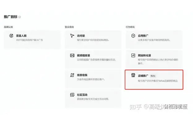 通常落地页引流会更多地用到网站转化量这个广告目标,所以如果有一些老板只投独立站的落地页,那在广告账户中是无法看到“店铺推广”的入口的,必须要将TikTok shop绑定BC和广告账户后才能够看到“店铺推广”选项。