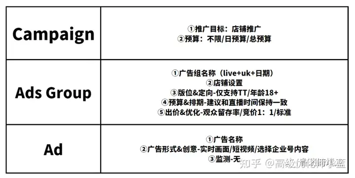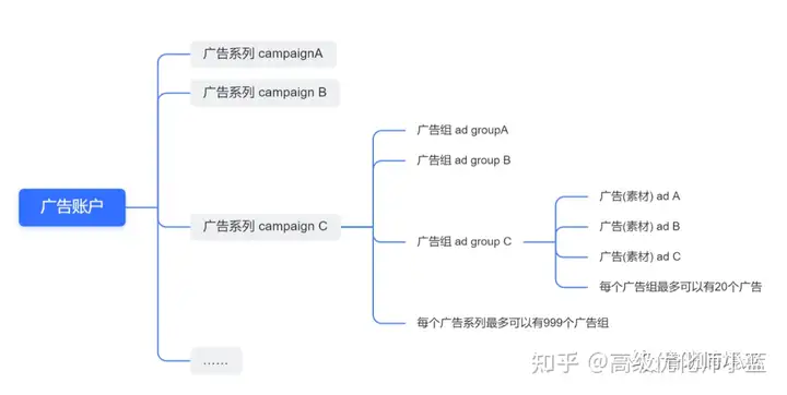 一般我们投放时,会根据产品或者市场区分不同的广告系列;在广告组层级的话,会根据受众、素材、竞价模式来做区分。