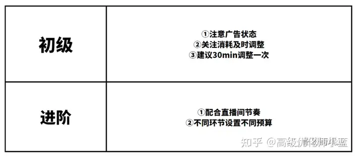 进阶的很多优化比较难,要配合直播间的节奏提前做沟通,在不同的环节设置不同的预算、不同的出价和不同的广告目标。