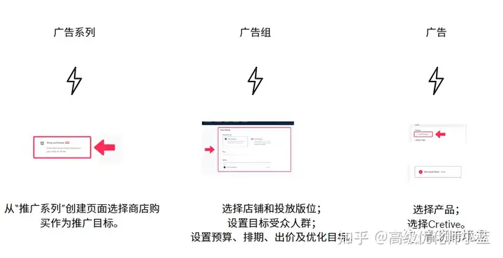 整体的逻辑架构分了三层,第一步是推广系列,然后设置开始的目标,即“店铺推广”;第二步就是创建组先选择店铺和身份,然后设置受众、预算,出价;第三步是直接创建广告,主要是选择产品,然后设置视频素材写上广告的文案后发布。等待审核后完成广告就可以顺利推广了。