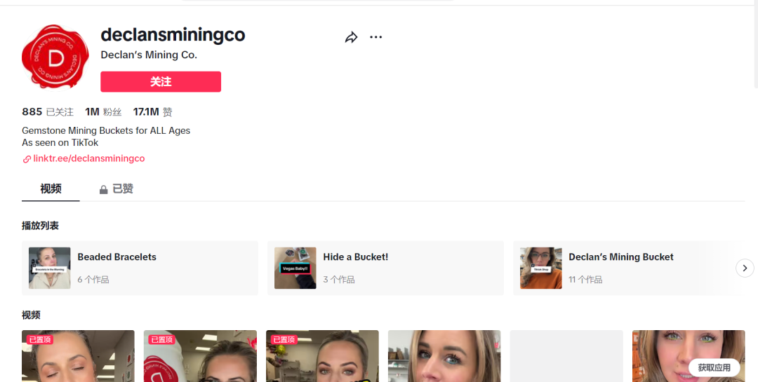 主页介绍是“TikTok上看到的所有年龄段的宝石开采桶”,通过在主页挂linktree汇合页,多个社交平台互相导流,部分客户也可以直接通过独立站完成购买。