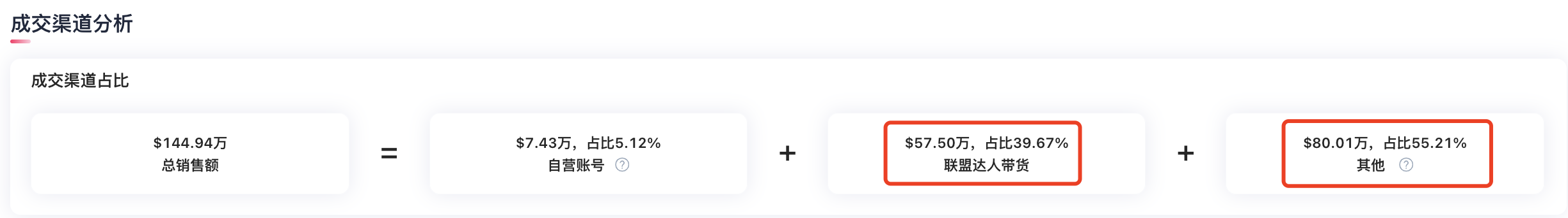 更令人称奇的是,这样的销售业绩几乎完全不依靠自身账号的力量,主要依赖达人带货,联盟达人带货比例占到近4成,而自营账号仅贡献5.12%。