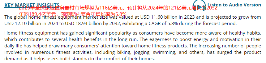 SupeRun这一品牌之所以能获得成功,离不开市场的推动。近年来,全球家用健身器材市场正在快速发展,呈现出了显著的增长趋势。 数据显示,早在2022 年,全球家用健身器材市场的规模就已经达到了80.7亿美元;2023年,这一市场的规模扩大到了116亿美元;预计今年,这一数字将会增长到121亿美元。而在未来几年,全球家用健身器材市场的规模还将以5.8%—8.3%的复合年增长率不断扩大,并将在2032年增长到惊人的189.4亿美元。