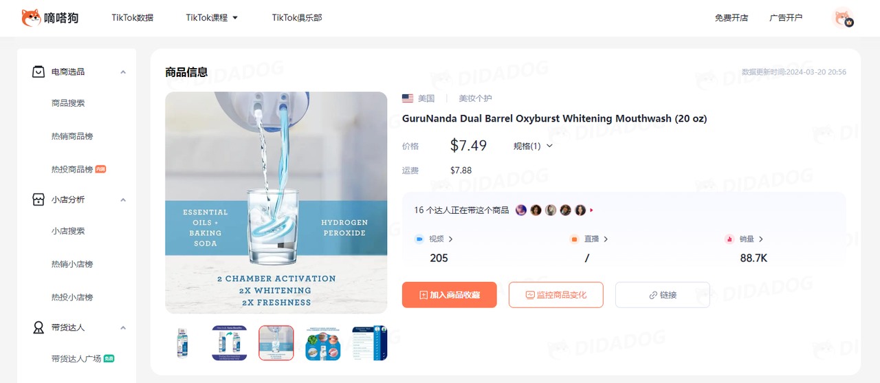 视频同款在TikTok Shop的价格为7.49美金+7.88美金运费,3.16日出1500单,过去30天销量达到1.9万单;嘀嗒狗数据显示,该商品在9月12日上线TikTok Shop,累计售出8.9万单,销量正稳步上升。所属小店GuruNanda LLC在TikTok Shop专注销售个人护理产品,其累计销售额接近2000万美金。