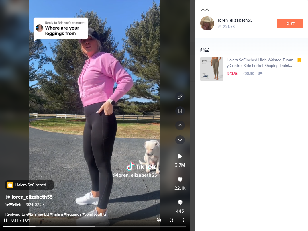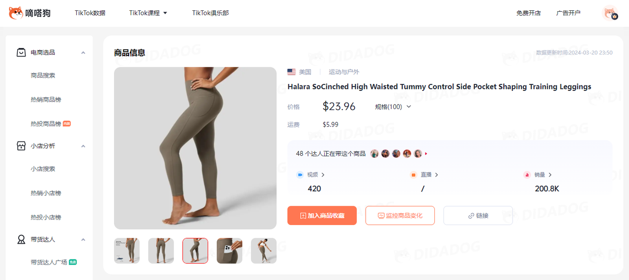 视频同款在TikTok Shop的价格为23.96美金+5.99美金运费,3.8日出1800单,过去30天销量达到3.6万单,嘀嗒狗数据显示,该商品在10月21日上线TikTok Shop,已经售出20万单。所属小店Halara US在女士运动装领域已经狂揽1700万美金,这款训练裤也是小店中的明星产品。