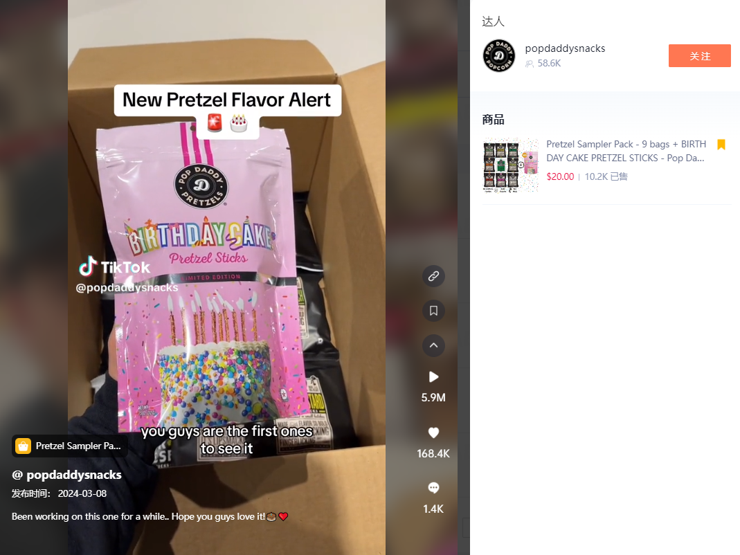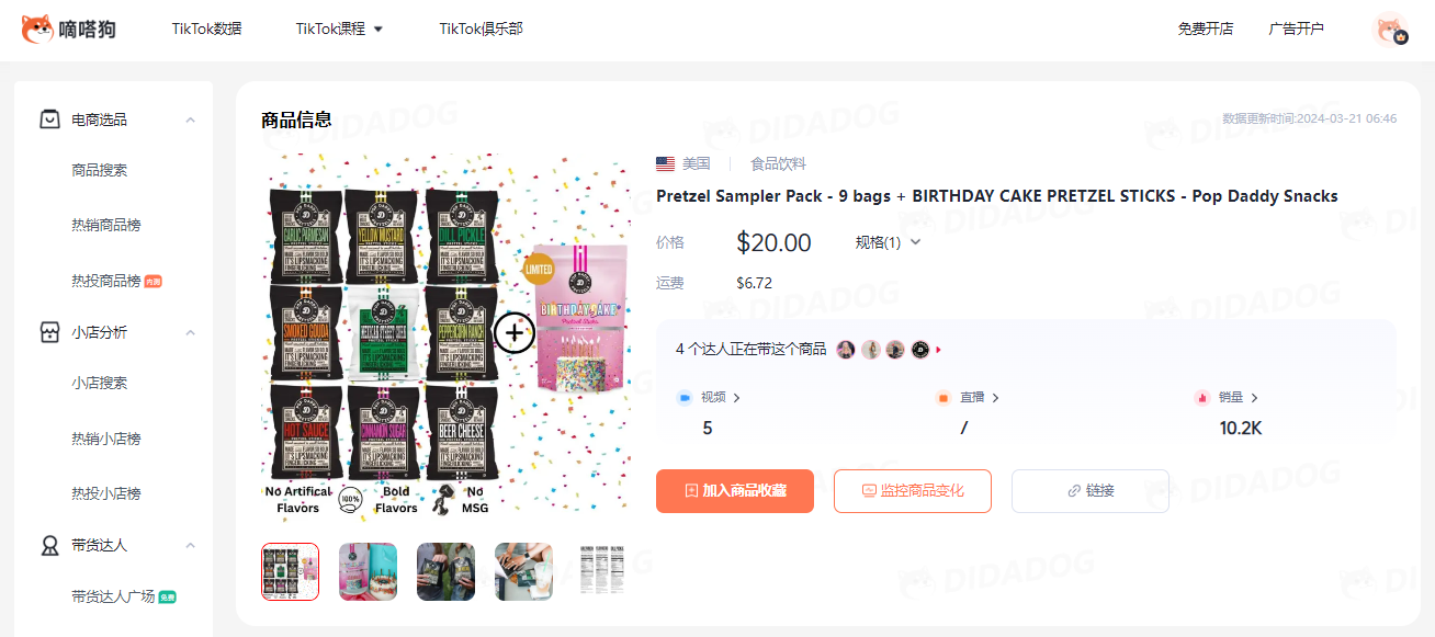 通过嘀嗒狗数据显示,视频同款在TikTok Shop的价格为20美金+6.72美金运费,该商品在3月9日上线TikTok Shop,目前已经售出1万多单,3月10日售出2000单。所属品牌Pop Daddy Snacks主营这类饼干零食,总销量破百万,销售额超160多万。