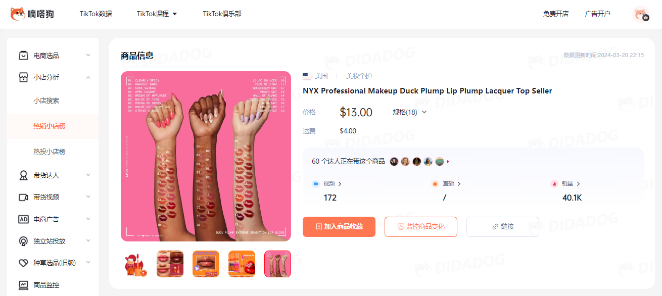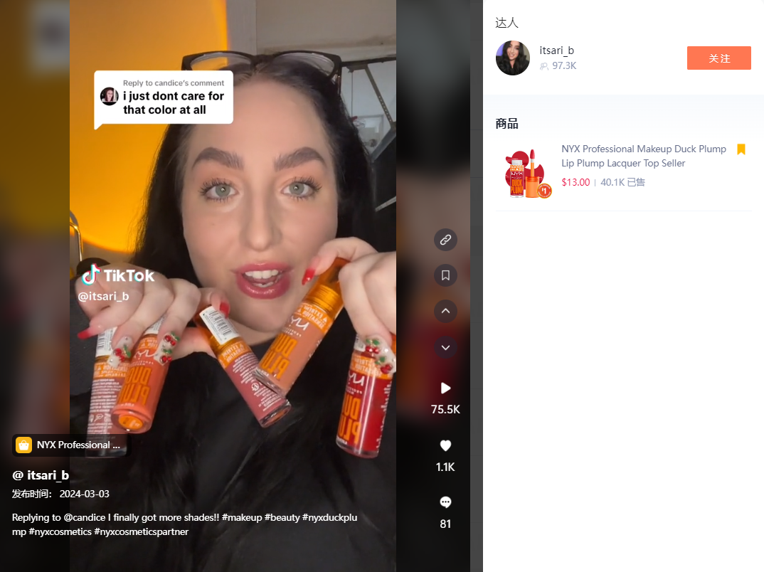 通过嘀嗒狗数据显示,视频同款在TikTok Shop的价格为13美金+4美金运费,该商品在11月上线TikTok Shop,目前已经售出4万单,在2.28单日售出1800单。所属美妆品牌NYX Professional Makeup上线后售出近百万美金。 通过嘀嗒狗官网可以查看到商品的评价,已经购买过的用户表示这款口红颜色丰富,涂抹顺滑,上唇之后也不会有太多的不适。