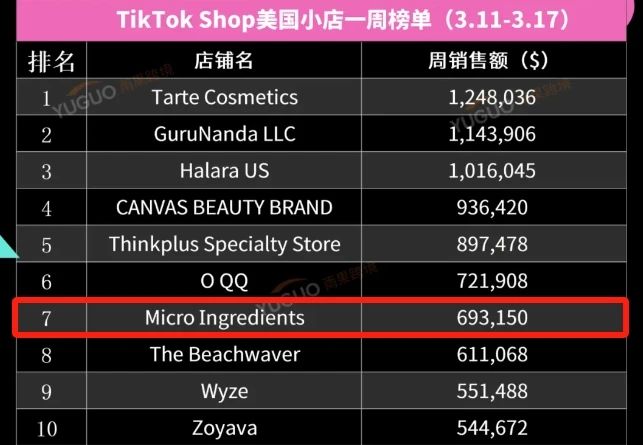 截至目前,该产品的销量已经突破了14万,总销售额近500万美元,作为一款保健品,能够在短时间内取得这般的成绩是十分令人惊讶的。在3月24日该产品更是一举成为了TikTok Shop商品销量榜的季军,日销量飙升到了惊人的近6000单。 正所谓“冰冻三尺非一日之寒”,实际上Micro Ingredients也并不是突然出现的黑马品牌,在此之前,该品牌就展现出了强劲的实力和潜力。 在更早一周,也就是3月11日至3月17日,Micro Ingredients在美国小店一周榜单汇总中同样排在第7的高位,周销售额约70万美元,其中爆款商品“多种胶原蛋白肽粉”一周内共计卖出 20473件。