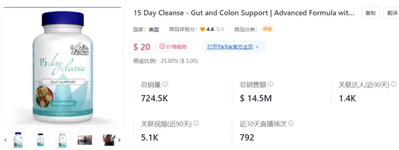 特别是在北美,作为全球最大的保健品消费市场之一,膳食保健等预防措施已经成为人们生活的一部分,在这样的背景下,享受到红利的自然不止Micro Ingredients。 此前,一款“15天肠道清洁保健胶囊”也登上TikTok热销榜,在当周以5.1万件的销量成为该类目热门畅销品。