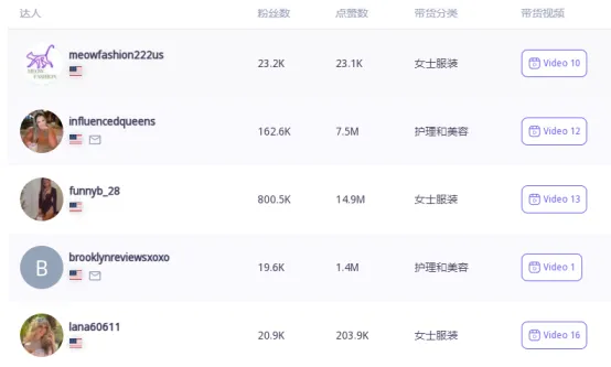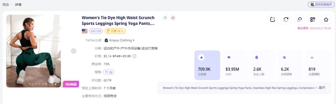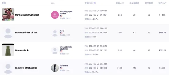 在挑选红人方面,品牌主要挑选中腰部网红,并结合小型网红的力量推广产品。其中,网红 @meowfashion222us 通过多方位展示产品的功能与时尚性,以及自身的穿着体验,仅仅作为一个小型网红,就为信友服装带来了 1.2k 的销售额。作为一个专门做时尚衣物的垂类账号,她拥有 23.2k 粉丝,为信友服装发布了 38 条 TikTok 短视频,总共获得了 23.1k 的点赞数,视频总播放数达到 4.9k。虽然 meowfashion 的粉丝体量不大,但通过稳定输送视频,抓住消费者高性价比衣物的需求,她为信友服装吸引了大量的买家。紧接着,当话题在 TikTok 上获得了一定的流量,并吸引到用户群体后,品牌借助网红营销的热度,同步开启了直播带货的销售渠道。在今年的 3 月 24 日,信友服装通过四个小时的直播,收获 1.5k 美金的销售额,观看人次达到 6.6k。