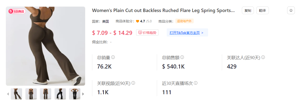 “运动户外”类目里,获得本期品类销量第一的是一款售价 7.09-14.29 美金的“女士春季运动连身裤”
