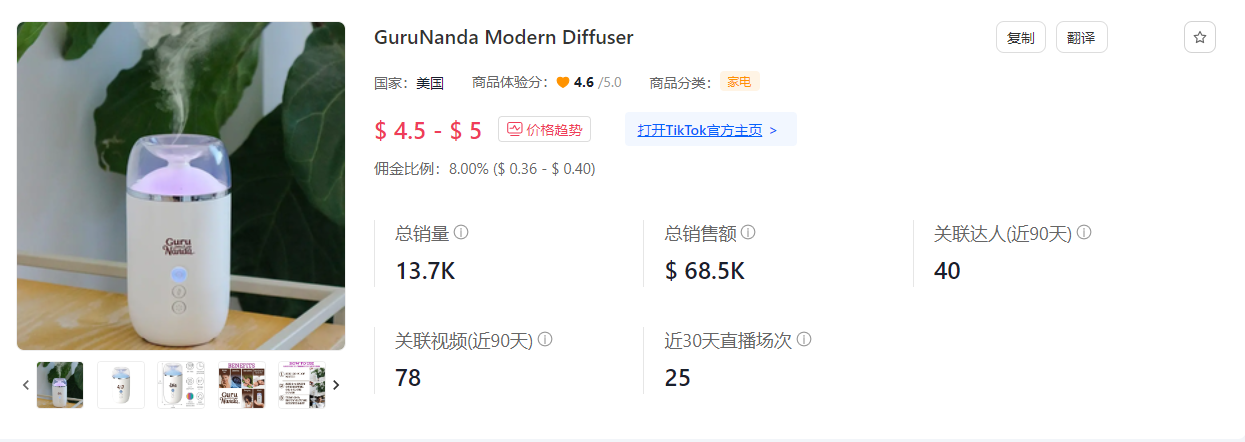 而在“家电”品类中,明星品牌店铺 GuruNanda 的一款香薰喷雾器又卖火了。