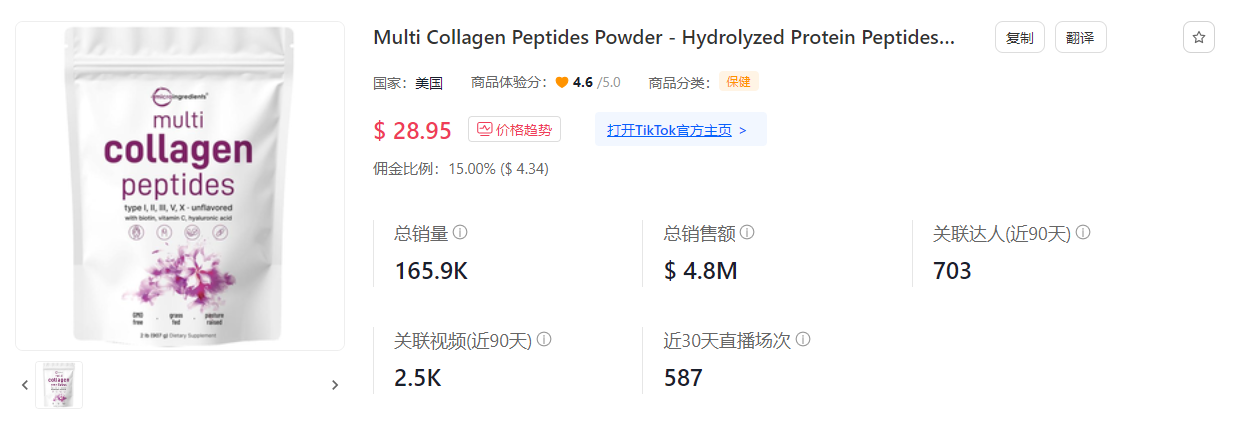 此外,榜二 @Micro Ingredients 凭借一款“微成分多胶原蛋白粉”的持续热销,已连续多期进入 Top10 榜单,本期产品也卖出了三万多件,销售额接近 80 万美元。