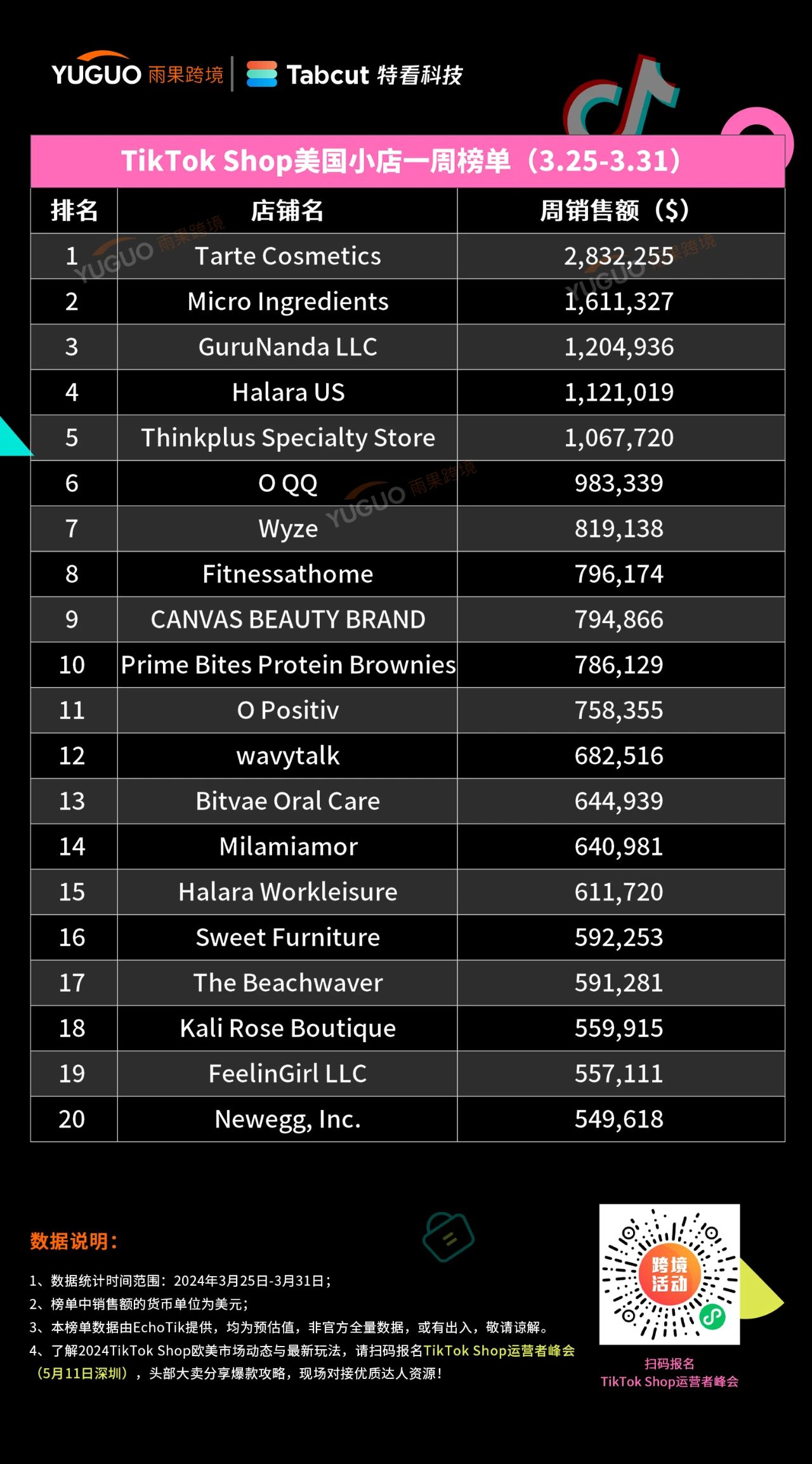 本期小店 Top10 榜单中,主营美妆个护类目有 3 家小店上榜,它们分别位列第一的 @Tarte Cosmetics 、位列第三的 @GuruNanda LLC 以及位列第九的 @CANVAS BEAUTY BRAND 。