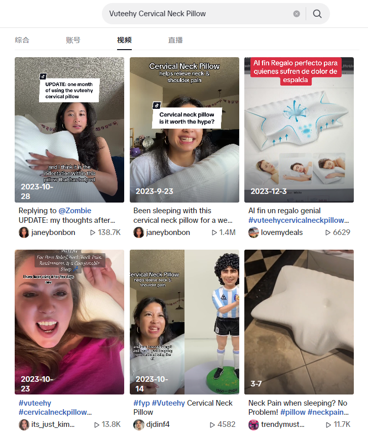 通过搜索商品名称“Cervical Neck Pillow”可以看到相关产品的推广视频。从这款枕头上线TikTok Shop开始,便一直有用户在分享这款枕头的使用体验,视频的浏览量从几万到百万不等。