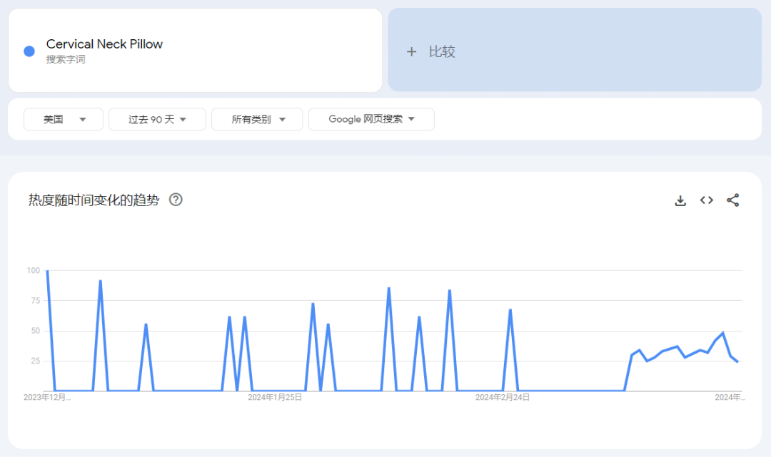 通过Google Trends我们可以了解到一定时期内,产品关键词在搜索引擎上的搜索热度和市场趋势。从下方搜索趋势不难看出美国地区关于“Cervical Neck Pillow”的搜索热度在1月左右达到峰值100,之后热度忽高忽低,但自三月份以来,这款枕头的热度逐渐平稳并正缓步上升之中