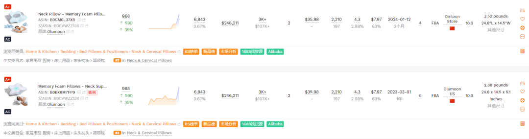 通过卖家精灵可以看到,关键词“Cervical Neck Pillow”在亚马逊的搜索量近5000个,三月销量超6000单,销售额达到24万美金,同时销量和评分也在不断上升之中。