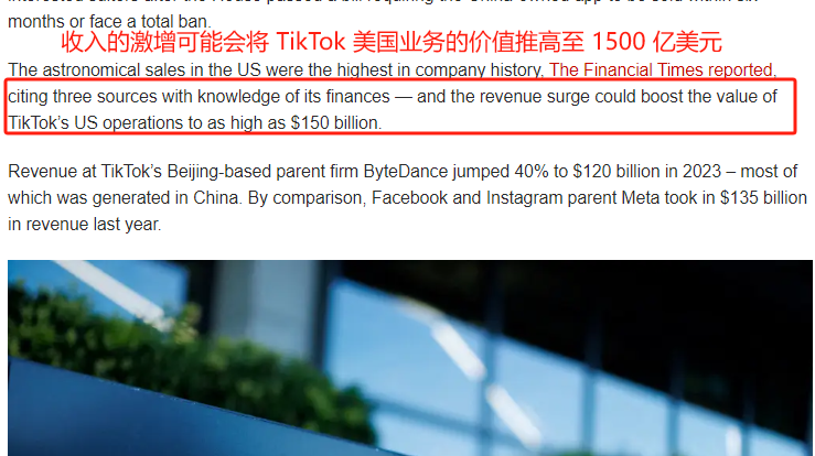 这一成绩其实并不让人意外,因为TikTok已经连续15个月保持这一殊荣。例如在2023年的1月、2月、9月和11月,TikTok均稳坐全球收入最高应用程序的宝座。连续多月霸榜全球收入榜单,足以可见TikTok的营收风采。 TikTok始终保持其收入领先地位与平台的收入来源紧密相关。目前TikTok的收入主要来自广告收入和应用内购买,尽管其并未透露具体的广告收入数据,但不少机构预测这将是一笔不菲的收入。 在应用內购买方面,来自data.ai的数据显示,TikTok在2023年年度应用内购收入达到40亿美元,这使其成为非游戏应用内购收入排行榜的第二名,仅此于YouTube。用这一数据做个参考:如果将40亿美元分摊到各个月,那么月均收入为3亿多美元。 TikTok出色的赚钱能力也带动了平台估值的飙升。 有消息称,得益于在美收入的激增,TikTok的估值或将飙升至1500亿美元。这让母公司字节跳动也跟着“吃香喝辣”,此前有报道评价:“字节跳动有望超过Facebook母公司Meta,成为全球销售额最大的社交媒体公司。”