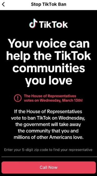 不管是在平台收入还是全球影响力上,TikTok的能力已经毋庸置疑。但在快速发展的背后,TikTok的处境已经非常艰难。 一方面,TikTok目前在美国正面临被封禁的危机。由于美国众议院不久前提交了新法案,要求字节跳动在165天内剥离对TikTok的控制权,否则将全面下架苹果和谷歌商店内的TikTok应用程序。 为了阻止美国新法案的实行,TikTok做出了一系列反击。其很快向美国1.7亿用户发出弹窗,呼吁用户致电美国国会,以避免TikTok被关停;同时TikTok CEO周受资也在努力游说。