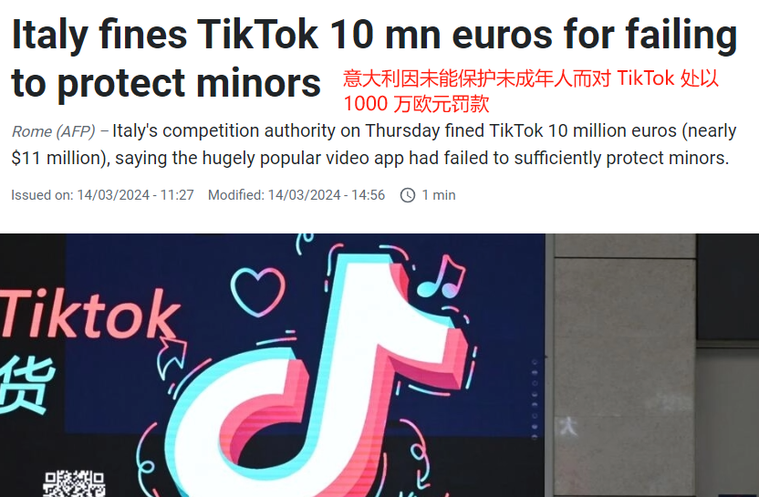 从目前的情形来看,TikTok的弹窗反抗似乎并没有起到多大作用。一波未平一波又起,在美国面临封禁的同时,意大利也开始向TikTok“发难”了。 意大利竞争与市场管理局(AGCM)表示,由于TikTok对平台内容的控制力度不够,其将对TikTok包括爱尔兰、英国和意大利在内的三家公司处以1000万欧元(约合人民币7820.7万元)的罚款。