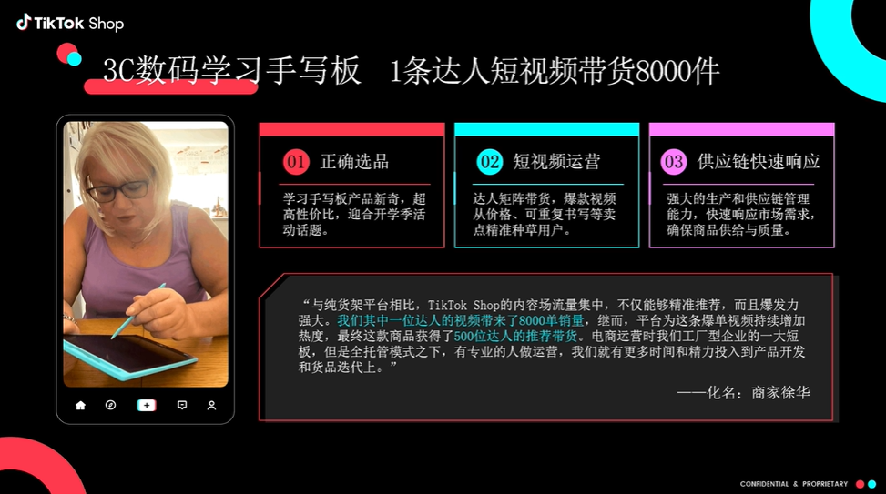 电商运营其实一直是工厂型卖家的痛点,尤其是3C数码厂家的优势在于更擅长做产品开发以及货品迭代,TikTok Shop 对比传统货架电商来说平台内容流量会更集中,种草人群更精准,同时通过用户后台标签也能精准给到商家商品推荐的流量带货,因此平台能协助商家做短视频运营,而商家只需要把重点精力放到商品开发以及产品质量保证和库存上,这样对于工厂型卖家来讲就会轻松很多。
