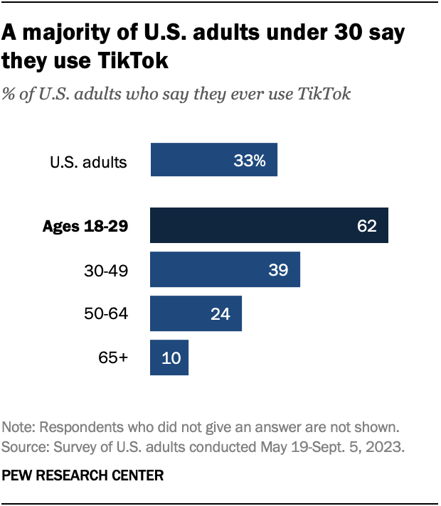 三分之一的美国成年人(包括大多数 30 岁以下的成年人)使用 TikTok。大约十分之六的 30 岁以下美国成年人(62%)表示他们使用 TikTok,而 30 至 49 岁的人中这一比例为 39%,50 至 64 岁的人中为 24%,65 岁及以上的人中为 10%。