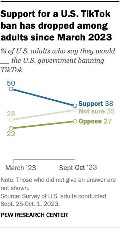 2023 年秋季,对美国 TikTok 禁令的支持有所下降。大约十分之四的美国人(38%) 表示他们会支持美国政府禁止 TikTok,这一比例低于 2023 年 3 月的 50%。略少的比例 (27%) 表示他们会反对禁令,而 35% 的人则态度模糊。这个问题是在众议院通过可能禁止该应用程序的法案之前提出的。