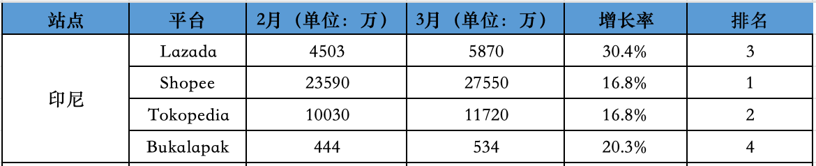 印尼站点,本土电商平台 Tokopedia 访问量较 2 月份上涨 16.8%,从 2 月份的 10030 万增至 2 月份的 11720 万;另一本土平台 Bukalapak 的访问量较 2 月份上涨 20.3%,从 2 月份的 444 万增至 3 月份的 534 万;