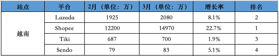 越南站点,本土电商平台 Tiki 访问量较 2 月份上涨 1.9%,从 2 月份的 687 万增至 3 月份的 700 万;另一本土平台 Sendo 访问量较 2 月份上涨 5.1%,从 2 月份的 79 万增至 3 月份的 83 万;
