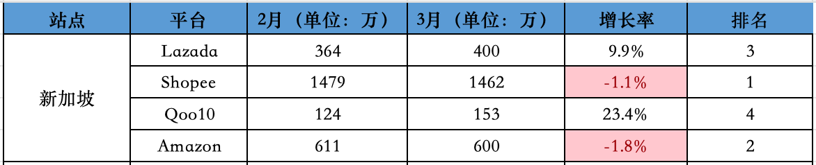 新加坡站点,Qoo10 访问量较 2 月份上涨 23.4%,从 2 月份的 124 万增至 3 月份的 153 万;Amazon 访问量较 2 月份下降 1.8%,从 2 月份的 611 万降至 3 月份的 600 万。