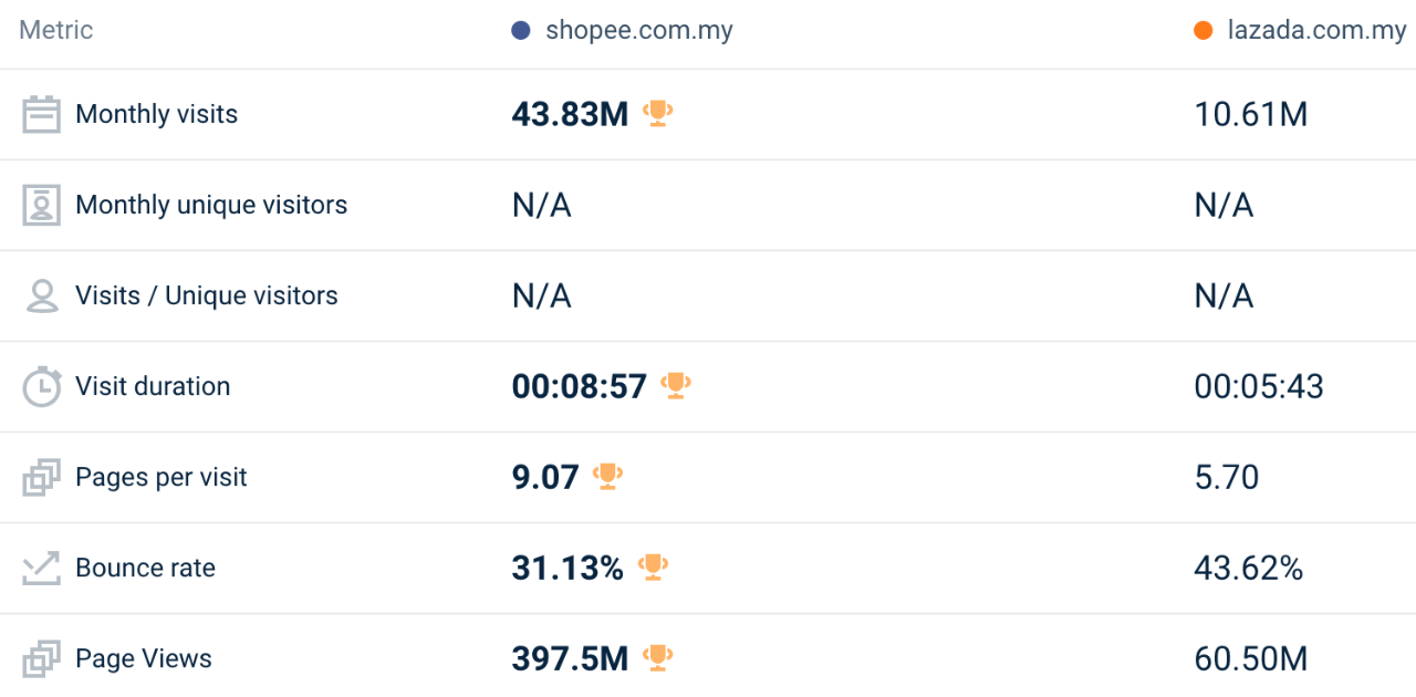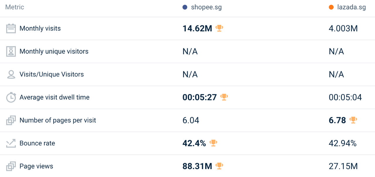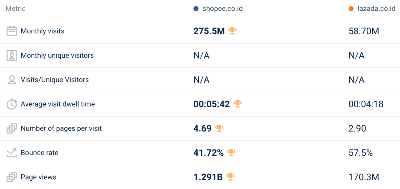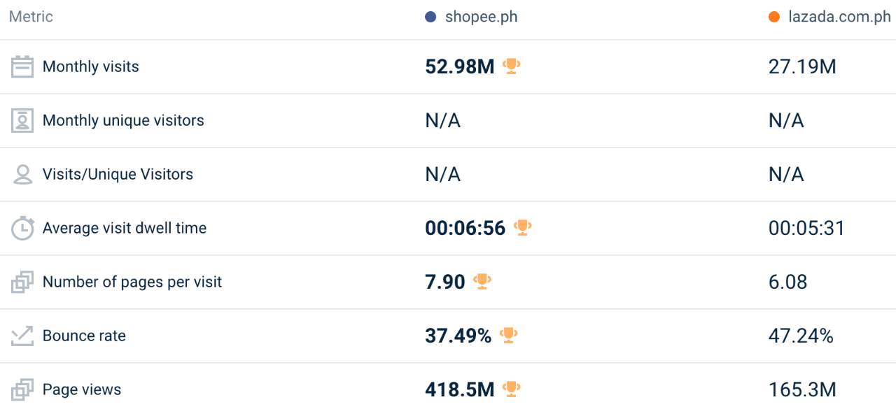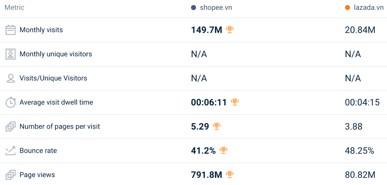 其中,Lazada 各站点的网站总访问量为 1.545 亿,较上月上涨 16.9%;Shopee 各站点网站总访问量为 6.272 亿,较上月上涨 17.9%;
