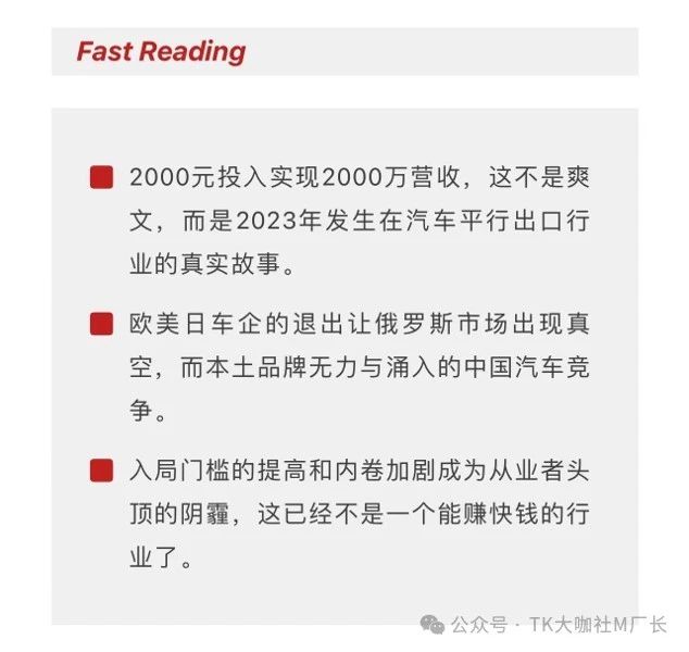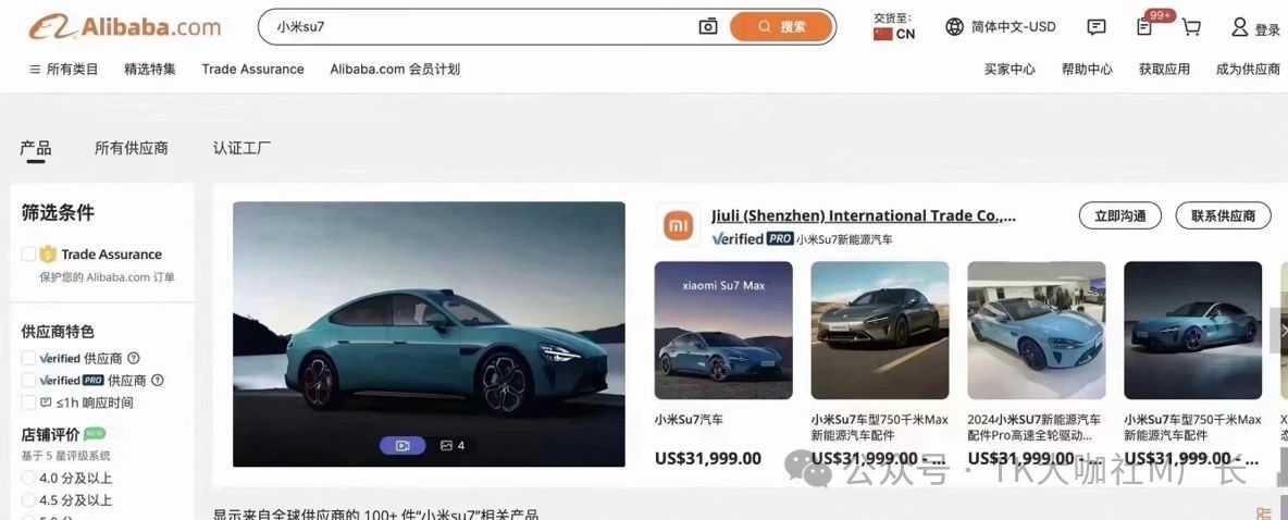 小米SU7已经在阿里国际站平台上架了。昨天唐总已经发布了相关消息。小米SU7的上架,无疑为中国制造业的出海之路增添了新的动力。目前来看,整个中国制造业的出海是一个必然趋势。我们也将分享更多关于制造业产品出海的概念和策略。我们也在考虑是否要涉足汽车领域,因为前段时间有个案例显示,仅用了三个月时间,就通过TK平台卖出了价值2000万的二手车。这个案例告诉我们,投入并不需要很大,甚至只需要2000元去买一台手机就可以开始。通过与二手车出口商合作,我们可以轻松地将产品销售到海外市场。当然,具体能赚多少钱,取决于你的流量获取能力和合作方式。对于小型创业团队来说,与其在视频或直播带货领域竞争,不如专注于B端市场,这对于中小团队来说无疑是一个更有发展潜力的方向。