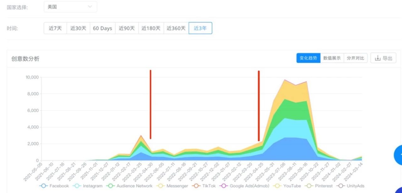 尽管在不断开拓新的渠道,Halara 在几家同类快时尚 DTC 品牌中一直是投放力度较大的一个。根据广大大数据,近 3 年 Halara 在 iOS 端的投放情况如下图,其中在 2022 年 5 月至 2023 年 3 月是 Halara 投放力度较小的时间。这段时间,Halara 在美区各渠道投放的创意总数在 1000-2000 之间。而另一家 DTC 服饰品牌 Cider 日常投放的创意数基本不超 100。