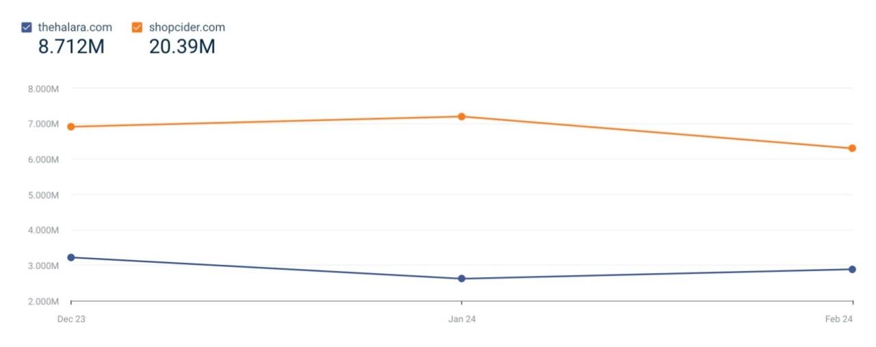 网站端的情况也相同,Halara 近 3 个月的网站访问量在 300 万左右,而成立时间相近的 Cider 网站月度访问量在 700 万左右。