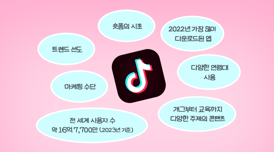 오늘날 틱톡은 2023년 기준, 전 세계 약 16억7700만 명의 사람들이 사용하는 글로벌 앱이에요🌎 과거엔 1020세대만 이용하는 앱이라는 인식이 강했으나 점차 콘텐츠가 다양해지면서 중장년층까지 연령대가 확대됐죠. 그리고 단순한 콘텐츠 제작에서 벗어나 숏폼 광고 마케팅 수단으로도 사용되는 등 여러 활용성을 보여주고 있는 앱이랍니다👍