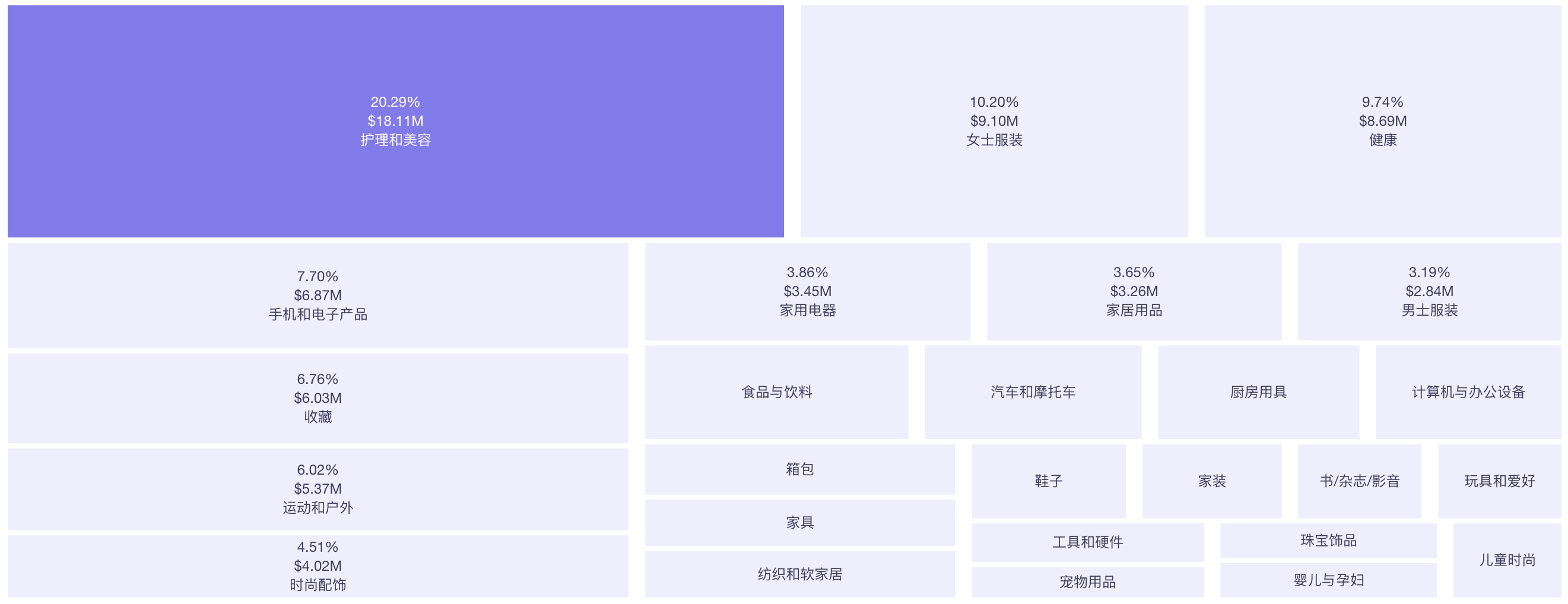 - 出单的GMV Top 5 的商品分类排名依次为:美妆个护、女士服装、健康、手机和电子产品、收藏;