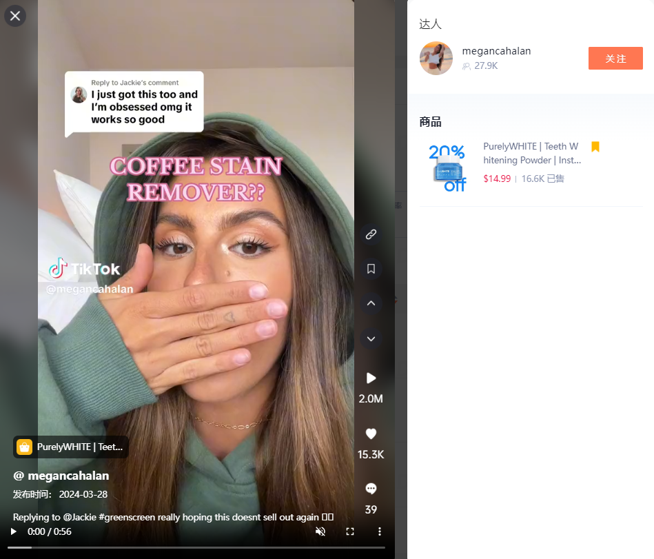 视频同款在TikTok Shop的价格为6.97美金+5.94美金运费,3.27日单日售出3100单,过去30天销量近2万单;该商品在12月16日上线TikTok Shop,累计售出超4.8万单。