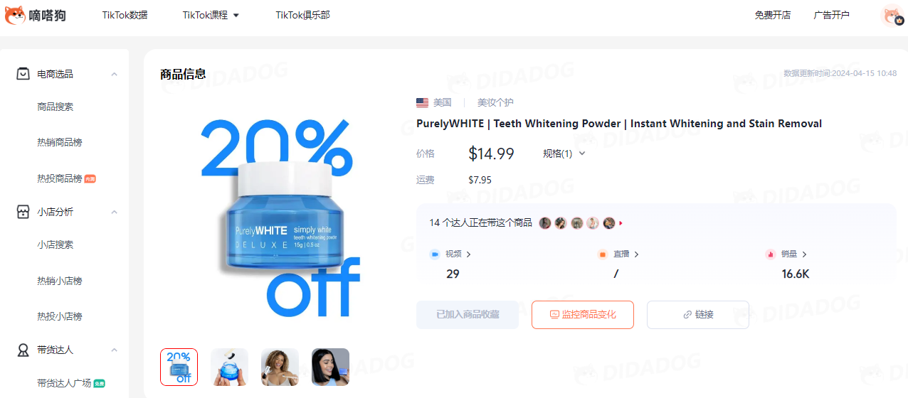 视频同款在TikTok Shop的价格为14.99美金+7.95美金运费,4.5单日售出1400单,嘀嗒狗数据显示,该商品在11月13日上线TikTok Shop,累计售出超1.6万单。所属小店PurelyWHITE DELUXE专注口腔健康与美白,销售额超100万美金,本产品是小店的明星产品之一。