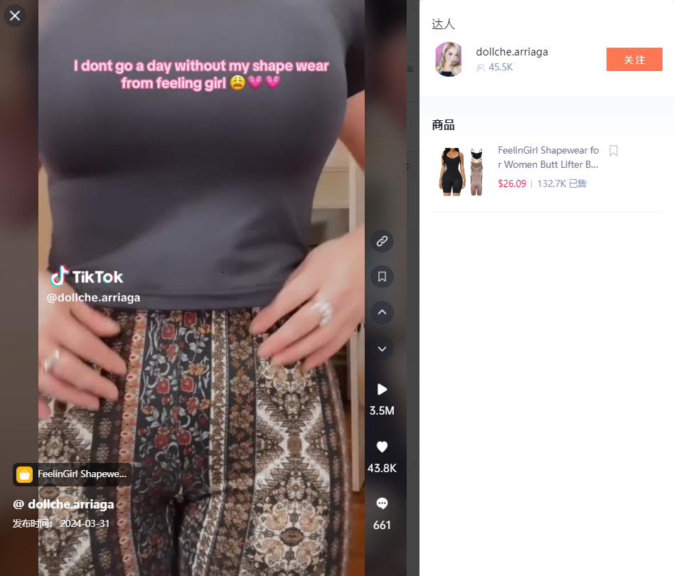 @dollche.arriaga的视频在3.31发布,嘀嗒狗后台观察到这条视频目前有超350万的播放量和43万点赞。视频中的博主展现了自己穿着这款连体衣后所拥有的完美的身材,也展示了这款产品极致的贴合感和无缝的设计。