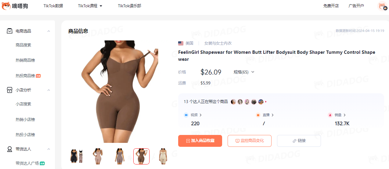 这款塑身衣在TikTok Shop的价格为26.09美金+5.99美金运费,4月4日以来的一周的日均出单超2000单,过去30天销量超4万单;该商品在9月3日上线TikTok Shop,累计售出超13万单。所属小店FeelinGirl LLC主营塑身的女士贴身衣物,本产品是小店的销量冠军。