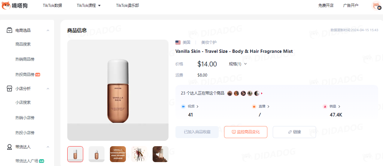 视频同款在TikTok Shop的价格为14美金+8美金运费,4月5日单日出货高达3200单,过去30天销量达到3万单;嘀嗒狗数据显示,该商品在11月16日上线TikTok Shop,累计售出4.7万单。所属小店Phlur Fragrances主营美妆个护产品,销售额超140万美金,本款产品位居榜首。