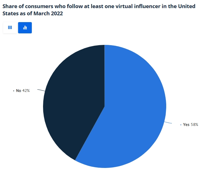 根据statista数据显示,2022年有58%的美国消费者表示他们至少关注了一个虚拟网红, 这说明虚拟网红在美国市场已经具有较高的知名度和影响力。