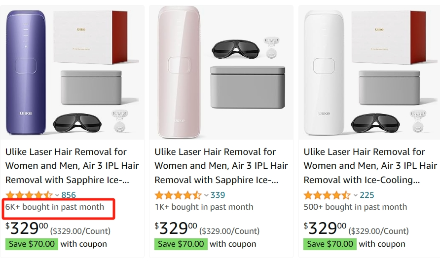 事实上,包括服装、配饰、美容产品在内的时尚品类,一直是大热的出海赛道。其中一些小品类近年更是爆发出了巨大的增长潜力,带动无数跨境卖家迎风崛起。 除了上文提到的塑身衣,脱毛仪也是一个比较典型的代表。一项数据指出,早在2020年,家用美容美体仪器市场的规模就已经突破了300亿元大关,这其中,家用脱毛仪市场的增长速度是最快的。有调查报告显示,超过半数的女性受访者都使用过家用脱毛仪,可见这一品类如今的关注度正在不断扩大。 乘着这一风口,许多脱毛仪品牌都实现了业绩的攀升。比如国货品牌Ulike,在国内发展了几年之后,它将目光投向了海外市场,并首先进军了北美这一全球最大的脱毛仪市场。此后,该品牌入驻亚马逊、打造电商独立站,同时积极进行社媒营销。最终,进入美国市场短短三个月,它就实现了千万以上的销量,成为了相关垂类的Top品牌,亚马逊上部分单品的月销量甚至能突破6000件。