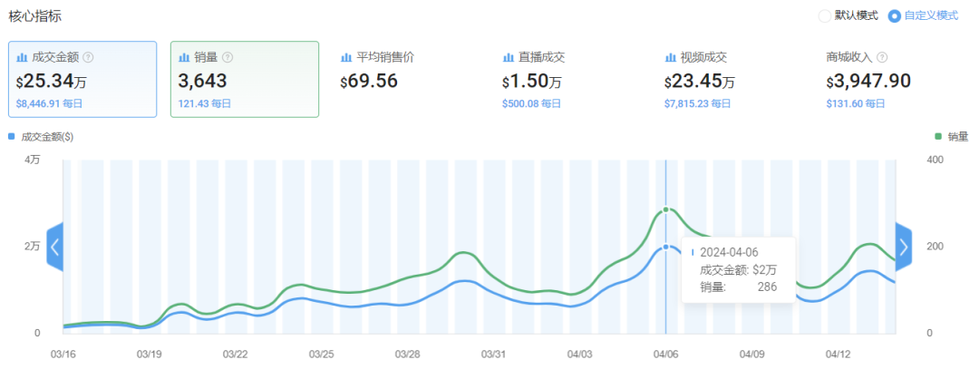 从商品销售近期(近30天)数据来看,在2024年4月6日,单日销量突破280件,销售额约2万美元,是近30天销售额最高的一天。