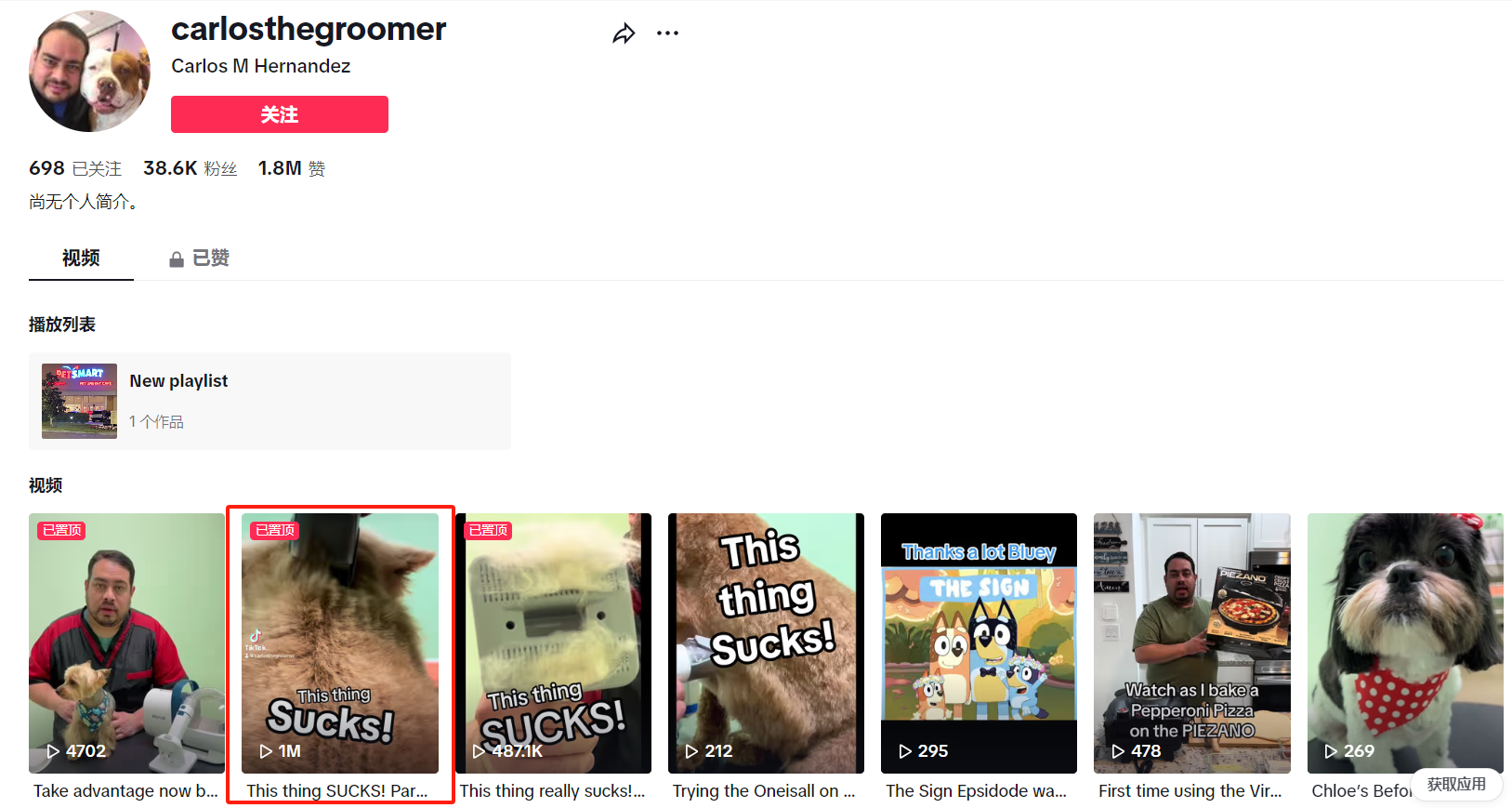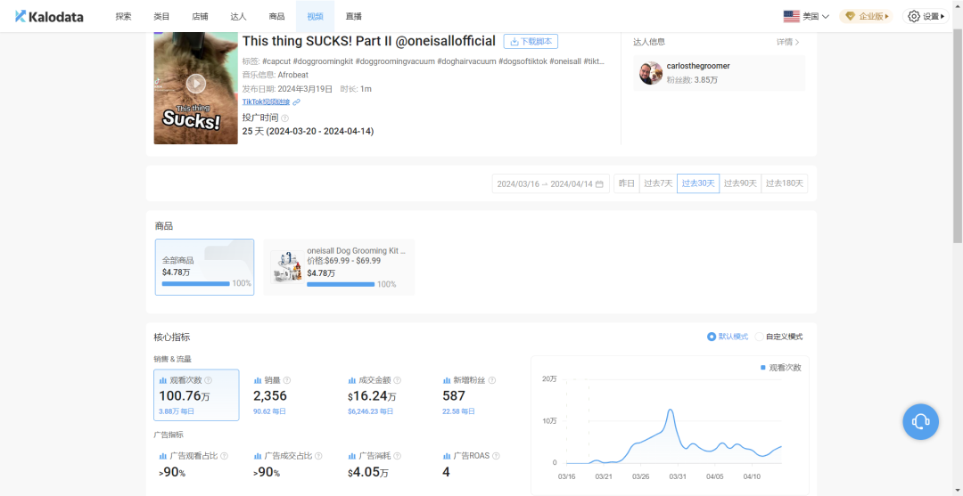 @carlosthegroomer达人24年3月20日发布的一条视频,成为了带货效果最佳的视频。他的粉丝数不到4万,属于尾部达人,不过发布的视频都跟宠物有关。说明找到合适的垂类达人进行推广有助于提升商品销量,粉丝数的多少不是必要条件,尤其是对于中小卖家预算有限的情况下,这样的选择可能更加高效。
