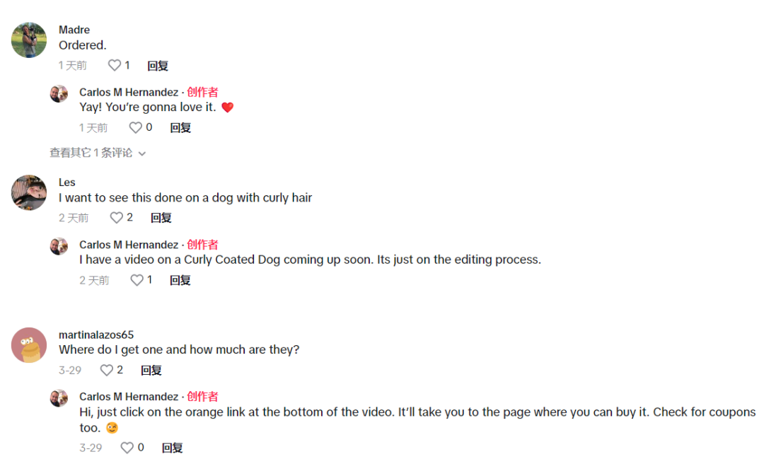 整个视频长达1分钟,主要展示了给狗狗使用产品功能画面,展现了宠物护理时刻更优雅、更轻松,告别杂乱无章的毛发这些卖点,从而激发用户的购买欲望。评论区中我们可以看到大量用户表示对该产品非常感兴趣,甚至部分用户已经购买,达人也非常积极的给予回复。